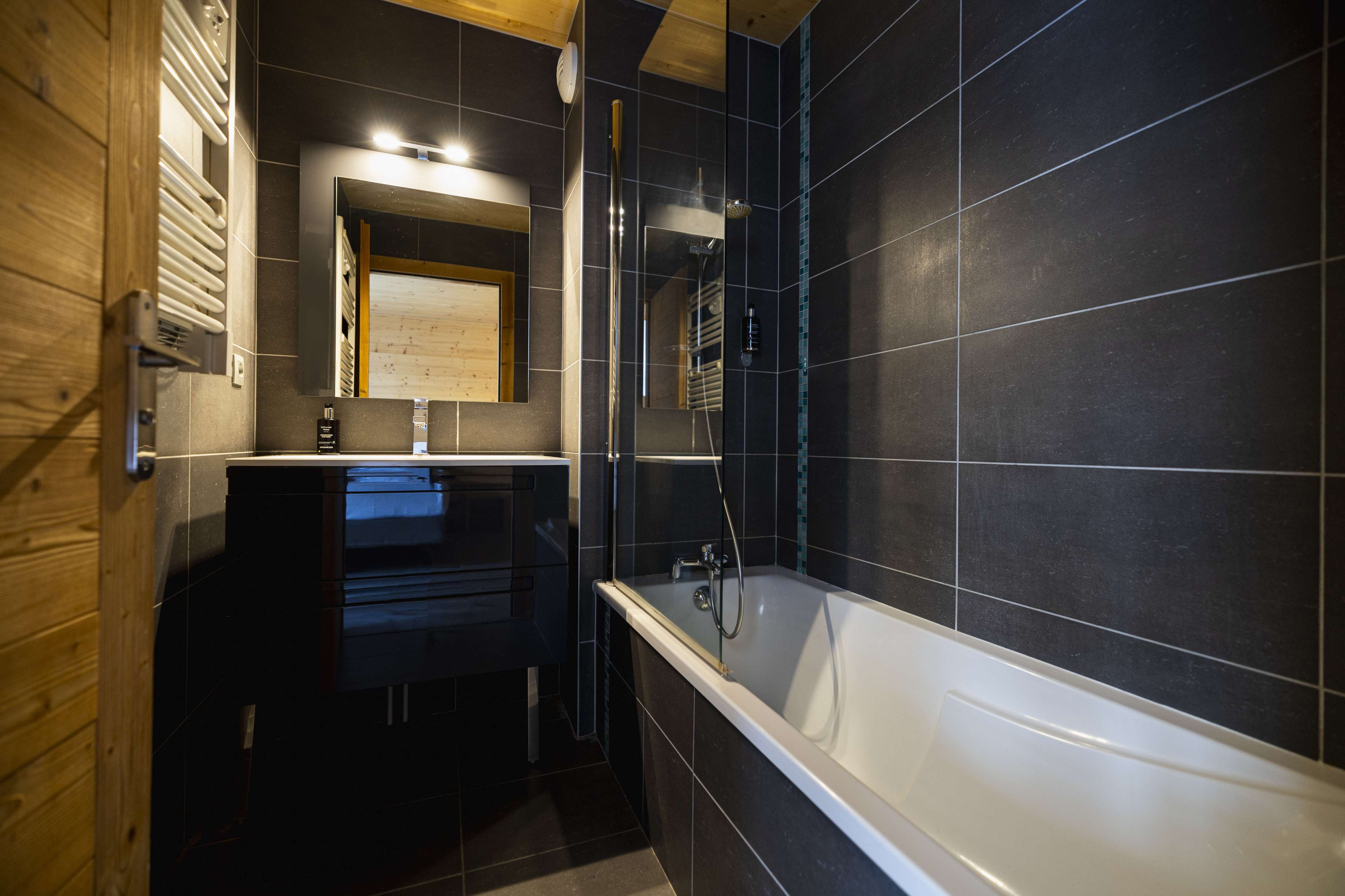 Appartement de 55m² composé d'une chambre et d'une sale de bain en sous-sol avec petites fenêtres, d'un séjour avec cuisine entièrement équipée et d'une salle de bain.